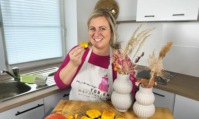 - Einen kleinen Hokkaido in Stücke schneiden und im Ofen bei 200° Ober-Unterhitze ca. 20 min weich garen. Abkühlen lassen und pürieren.
