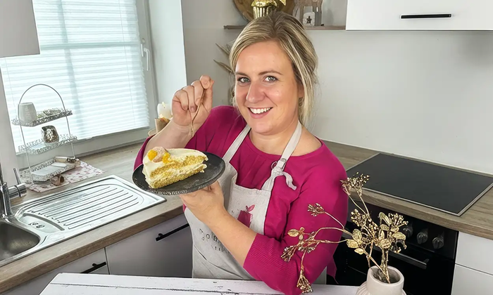 Frau steht mit Schürze in der Küche und hebt gerade den Topfdeckel an. Auf der Arbeitsfläche sieht man geschnittene Tomaten liegen.
